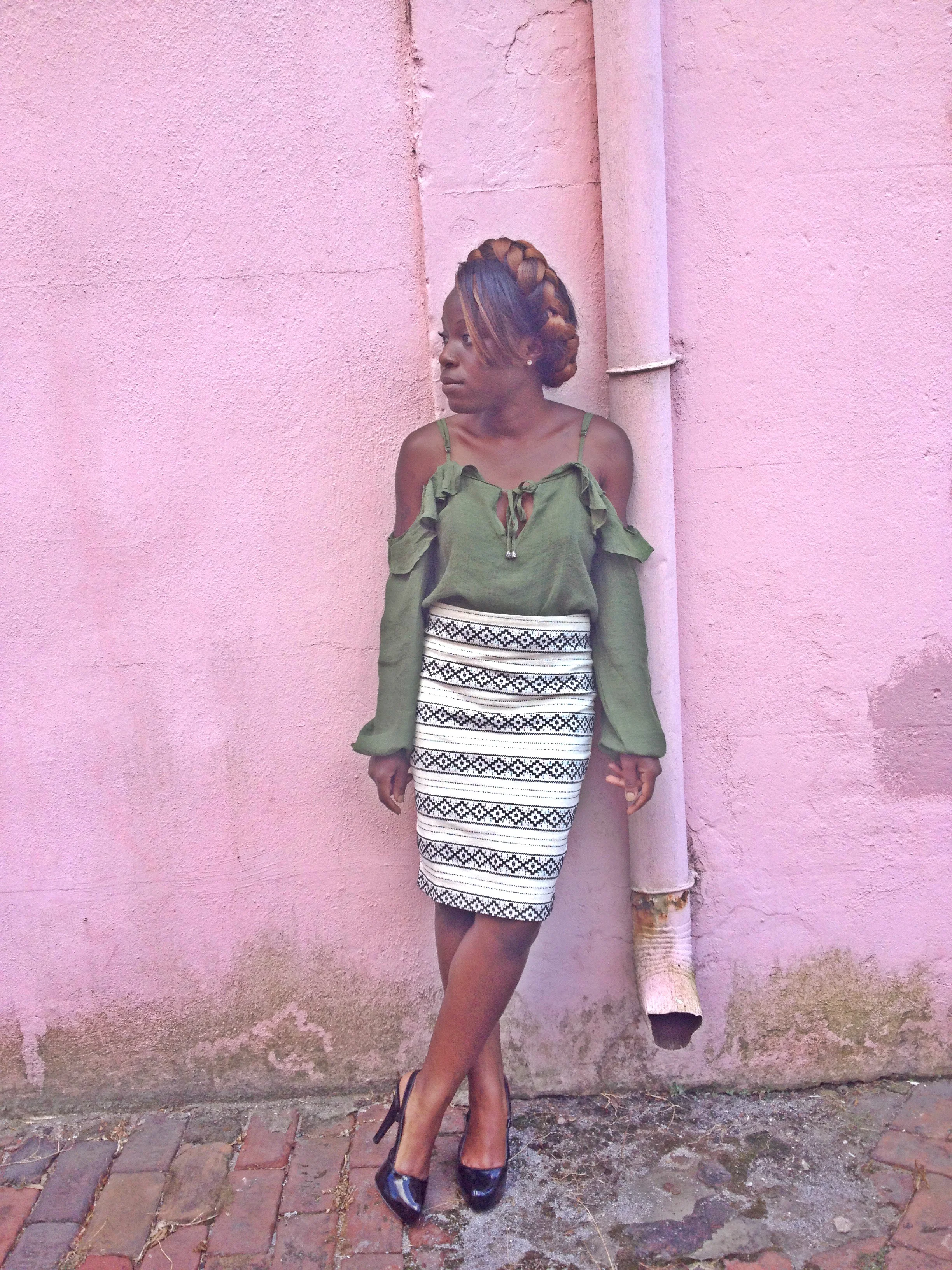 Whats the biggest trend that has hit the streets lately? This off the shoulder ruffled top! It can be seen in almost every name brand store because it has a feminine spark to it yet adds a touch of sexy with a peekaboo sleeve. Its the best of both worlds! As soon as you slip this top on your "senorita bonita" vibe instantly hits you! This is totally a top pick for a nice date night to keep your date adorned by you. The olive toned top has everyone choosing this color this season because its perceived as sophisticated and chic. Of course I paired it with my tribal pick of the week, this nude skirt with a pattern that repeats horizontal. Another tip that really vamps this blouse is your hair. Want a soft look, then go for a halo. Want to be on sleek and business casual ? Pull your hair back in a bun. This hot commodity is so much fun to dress up !
