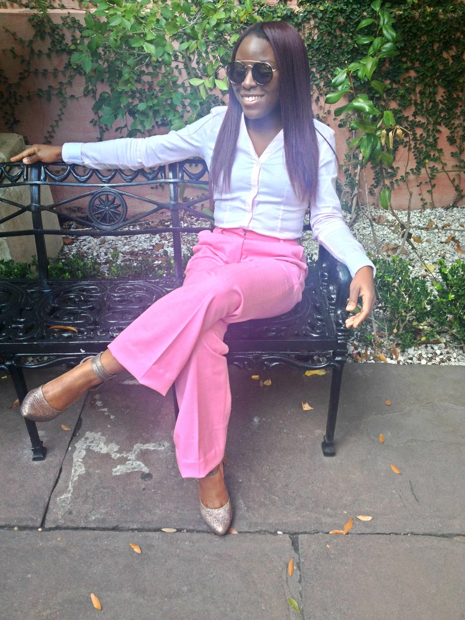Simplicity goes a long way when wearing soft hues like these shades of pink this winter. If you want to make your outfit simply beautiful without trying too hard, try putting together the same or similar shades to get that seamless look. When I first tried on these bubblegum pink pants I instantley felt like I wore the "pants" in my life! So I pulled up these statement trousers to a high-waisted look, added a pastel button down top, and watched the magic happen! Look at what this pop of color can do to your confidence. I’m feeling like I can conquer the world right now! Who said you can’t add pink in the winter, be feminine & still be the Boss!